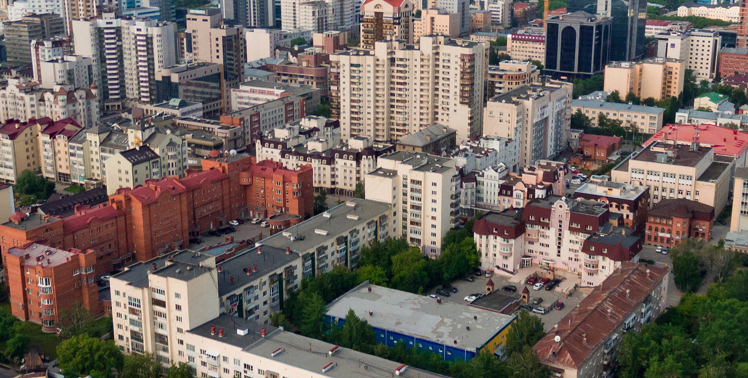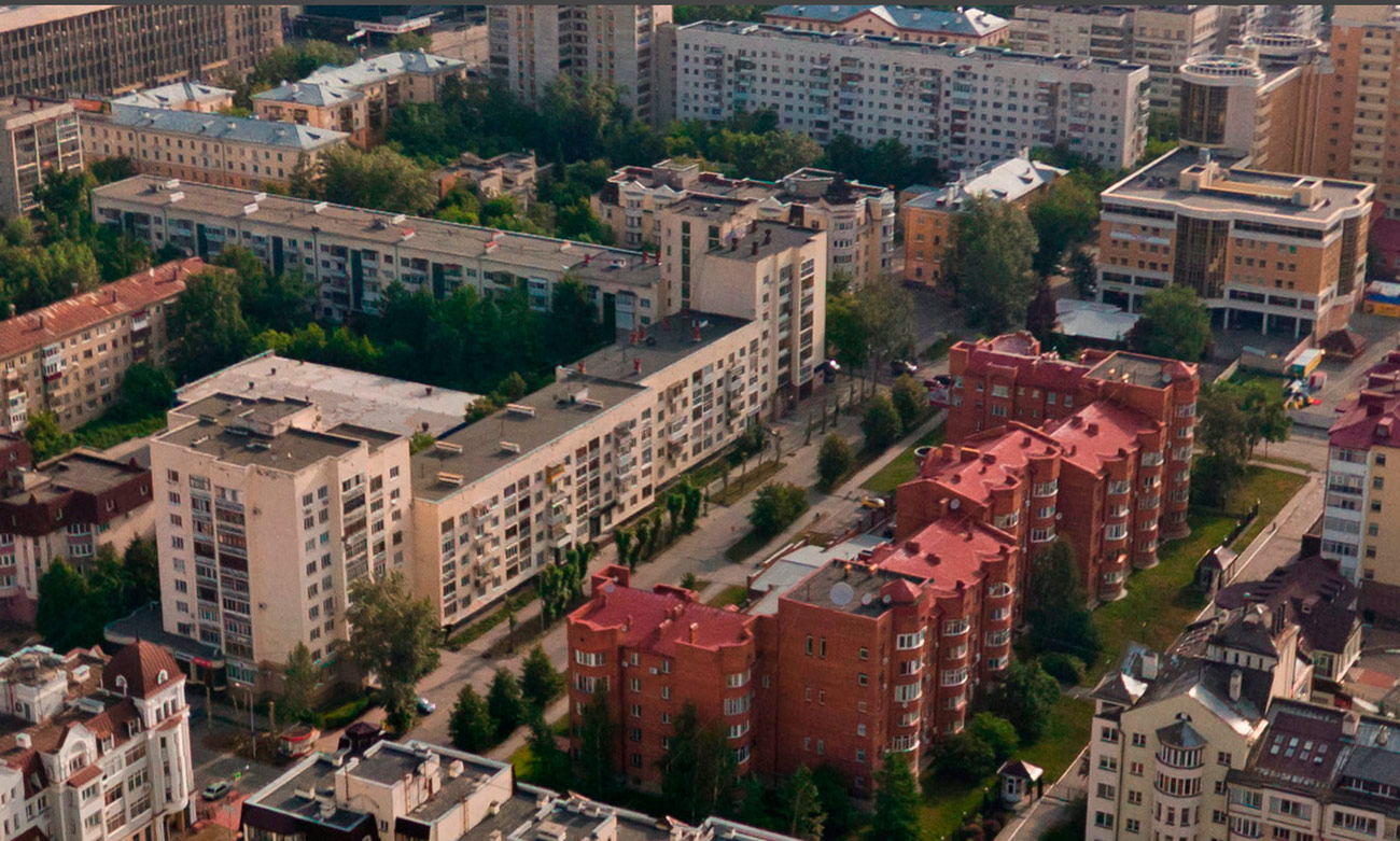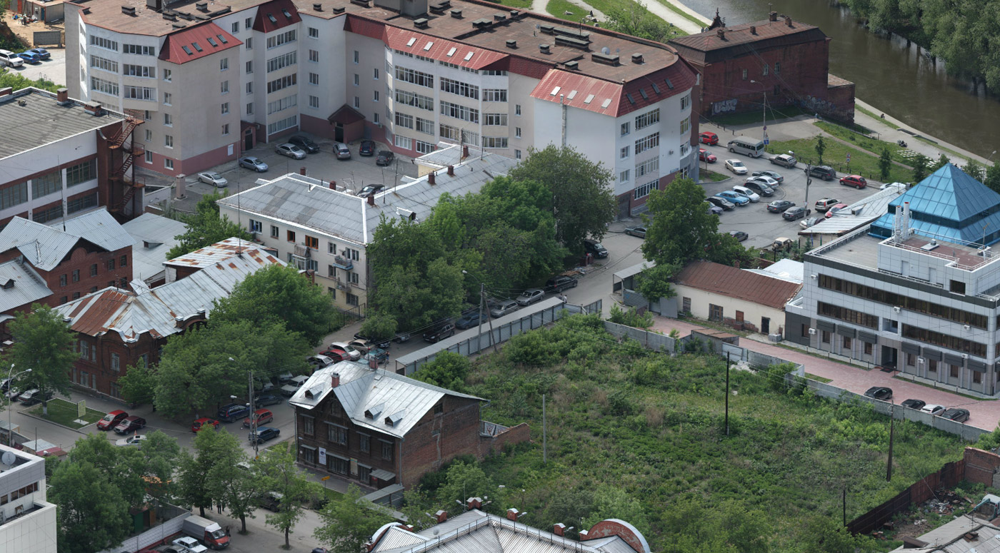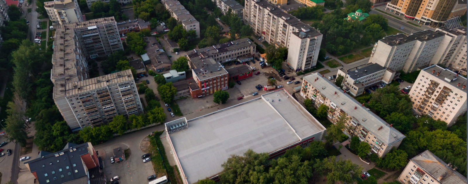 Здание с плоской кровлей - это ДЮСШ по хоккею "Спартаковец" (ул.Энгельса, 31а). Фото SKYPHOTO Ural. 2016 год. ![]() |