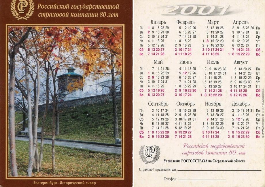 Карманный календарик "Управление Росгосстраха по Свердловской области. 2001 г."