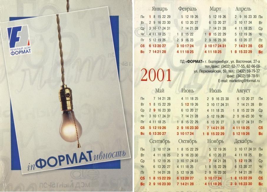 Карманный календарик "г.Екатеринбург. Издательский дом «Формат». 2001 г."