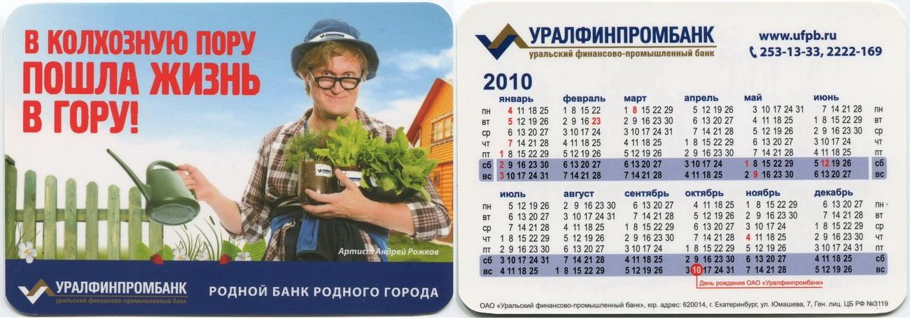 Карманный календарик "г.Екатеринбург. Уралфинпромбанк. 2010 г."