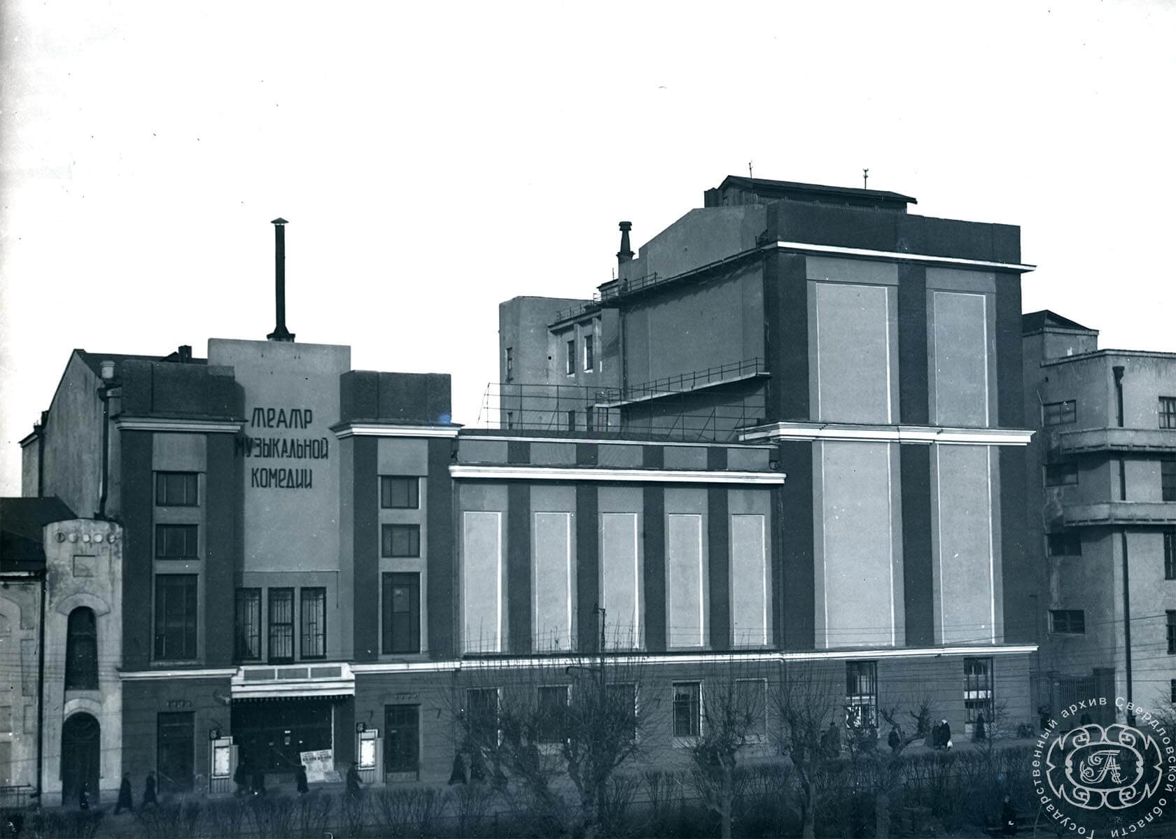 Архитектор К. А. Полков. В 1913 году кинотеатр «Лоранж» переехал в собственное помещение, построенное Коммерческим собранием на противоположном углу перекрестка Главного и Вознесенского проспектов (ныне пр. Ленина и ул. К. Либкнехта). Это было двухэтажное здание в стиле модерн, с характерным для него рисунком оконных и дверных заполнений. В 20-е г. "Лоранж" переименован в «Совкино». Кинотеатр «Совкино» закрылся в 2007 году. --------------------- г. Екатеринбург, проспект Ленина, д. 47 / ул. Карла Либкнехта, д. 20. Объект культурного наследия областного (регионального) значения «Здание театра музыкальной комедии, 1933 год; 1962 год, архитекторы Емельянов В.В., Орлов Б.Н.» Еще в середине XIX века на углу Главного и Вознесенского проспектов сформировалась небольшая усадьба, принадлежавшая екатеринбургскому чиновнику Покровскому Николаю Корниловичу. В состав усадьбы, по данным 1889 года, входили деревянный одноэтажный дом, деревянные службы, баня и кучерская. К концу XIX века – началу XX века деревянные постройки усадьбы пришли в ветхое состояние, дом был снесен. В 1909 году на участке бывшей усадьбы было построено здание кинематографа «Лоранж» по проекту екатеринбургского архитектора К.А. Полкова. Здание решалось в стиле модерн, с характерным для него рисунком оконных и дверных заполнений. Вдоль проспекта, вплотную к кинематографу, в 1915 году было построено здание Коммерческого собрания по проекту К.Т. Бабыкина. Здание собрания отличало от рядом стоящего кинематографа классическая композиция – с колоннами у главного входа, подчеркивающая солидность клубного здания. Наружная отделка фасадов, как и кинематографа «Лоранж» выполнялась в духе т.н. «кирпичного стиля». В коммерческом собрании, которое еще называли клубом приказчиков, действовала небольшая оперная труппа. В 1920 году в здании открылся Дом Октябрьской революции, в котором проводились городские собрания, лекции, концерты, одно время тут работал театр рабочей молодежи – ТРАМ и помещался клуб строителей. В 1924 году здесь выступала ленинградская труппа сатиры «Летучая мышь». В 1932-1933 годах здание клуба перестраивается под театр. Автор проекта реконструкции не установлен, возможно, им был инженер Лебединский. В результате реконструкции уличный фасад здания кардинально видоизменен, теперь он был решен в стиле конструктивизма. 8 июля 1933 года опереттой «Роз-Мари» здесь открылся Свердловский театр музыкальной комедии. Очень скоро театр стал одним из любимых у свердловчан. На его сцене ставились премьерные произведения, которые впоследствии вошли в репертуар многих театров оперетты страны: «Сотый тигр» Б. Александрова, «Табачный капитан» В. Щербачева, «Акулина» И. Ковнера, «Марк Береговик» К. Кацмана, «Анютины глазки» Ю. Милютина. В театре в разные годы работали выдающиеся актеры: М. Викс, С. Дыбчо, А. Маренич, Э. Высоцкий, Е. Коринтели, С. Духовный, Н. Энгель-Утина, Л. Сатосова, В. Сытник, Л. Невлер. В конце 1950-х годов встает вопрос о реконструкции зданий кинотеатра «Совкино» и театра музыкальной комедии. Проект реконструкции разрабатывался в 1960-1961 годах в мастерской Свердловского проектного института «Свердлоблпроект», под руководством Емельянова Владимира Владимировича. По проекту предусматривалось увеличение площадей театра за счет здания «Совкино». Изменению подвергались и уличные фасады здания. В 1962-1963 год