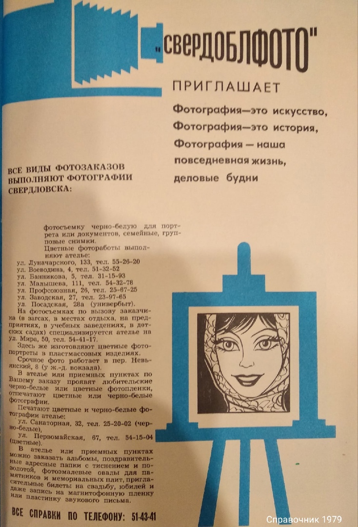 Пользователь ВКонтакте Сергей Делькин выложил список фотоателье Свердловска из справочников 1979 и 1990 годов.