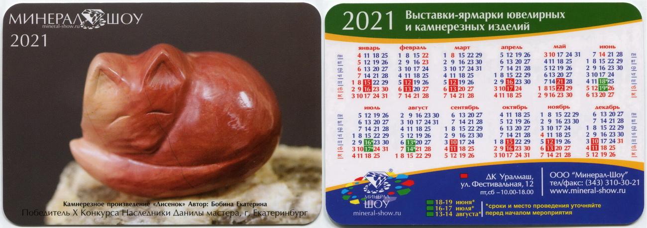 Карманный календарик "г.Екатеринбург. Выставка-ярмарка «Минерал-Шоу». Камнерезное произведение «Лисёнок». 2021 г."