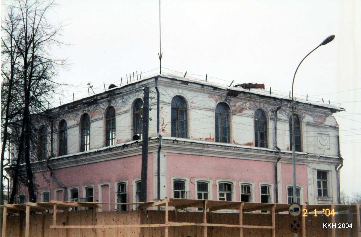 Незадолго до полного сноса. 2.01.2004 В справочнике за 1912 г. по этим адресам указаны: Симоновская, 12 - еврейская община (возможно вход с лестничной клетки на третий этаж) Тихвинская, 14 - дом М.А. Тимофеева Что может означать архитектурный элемент на пристроенной лестничной клетке пока не нашёл. |