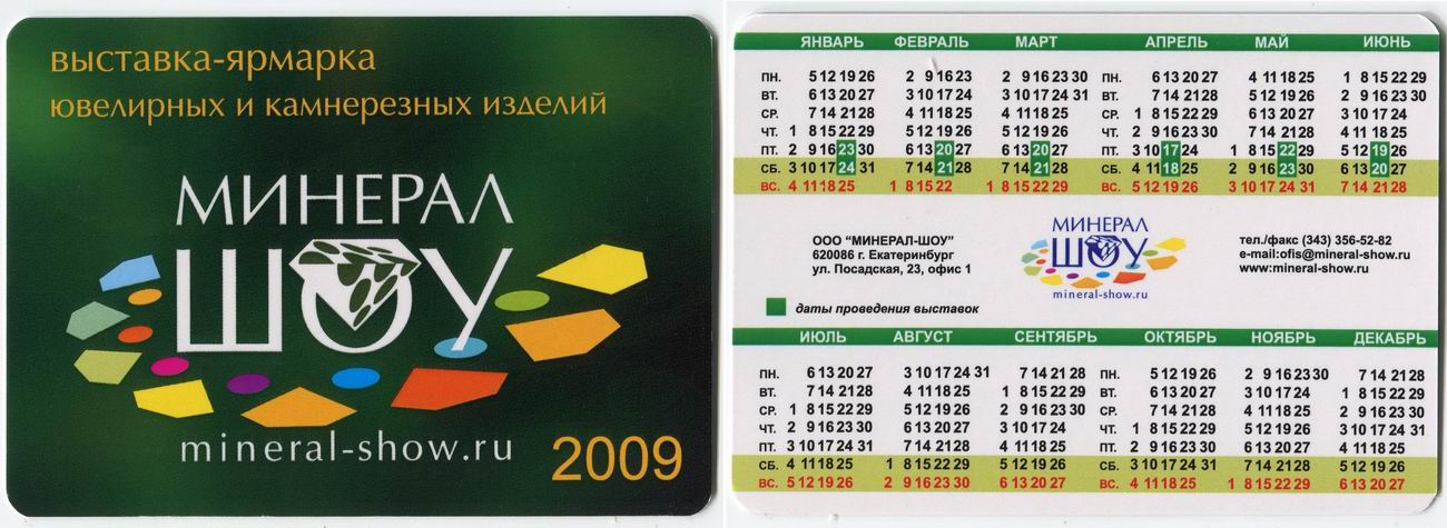 Карманный календарик "г.Екатеринбург. Выставка-ярмарка «Минерал-Шоу». 2009 г."
