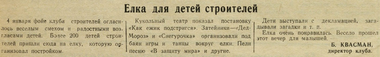 Б.Квасман. "Свердловский строитель". 9 января 1951г. ![]() |