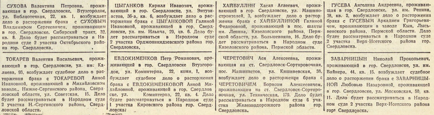 ул.Библиотечная, 22. Сухов Владимир Сергеевич. Сибирский тракт, 22. Токарев Валентин Васильевич. ул.Каляева, 93. Токарева Анна Ивановна. Цыганков Кирилл Иванович. ул.Энтузиастов, 36а. Цыганкова Галина Ивановна. ул.Ильича, 29. Евдокименко Петр Романович. ул.Коминтерна, 22. Евдокименкова Анна Михайловна. Хайбуллин Хасан Аглеевич. ул.Машиностроителей, 3. Хайбуллина Галина Федоровна. ул.Большевиков, 16. Черетович Ася Алексеевна. ул.Кишиневская, 38. Черетович Борис Алексеевич. ул.Техническая, 179. Гусева Ангелина Андреевна. ул.Репина, 38. Гусев Аркадий Григорьевич. Заварницын Николай Прокопьевич. ул.Вайнера, 44. Заварницына Люьовь Назаровна. ул.Московская, 50. "Вечерний Свердловск", 3 февраля 1958г. ![]()  |