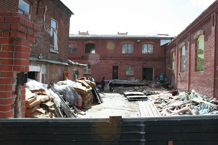 Начинается потихоньку снос Октябрьской, 25. Строение состоит как-бы из двух частей, соединенных между собой. Вторая часть - новодел, но с архитектурной точки зрения - достаточно приличное, "под старину", 2-я часть двухэтажное строение конца 19, начала 20 века, "кирпичный стиль", в хорошем состоянии. На месте всего этого планируют ТЦ по проекту японского архитектора, зайдите на сайт компании RED - там все видно.