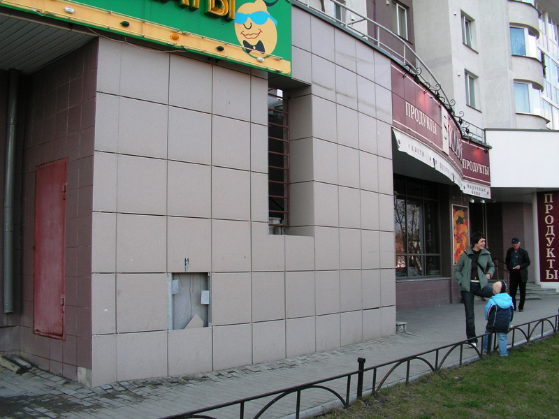 Вот он, "вентилируемый фасад" на доме Блюхера, 45 - разбит злодеями, зато видно его "устройство"
