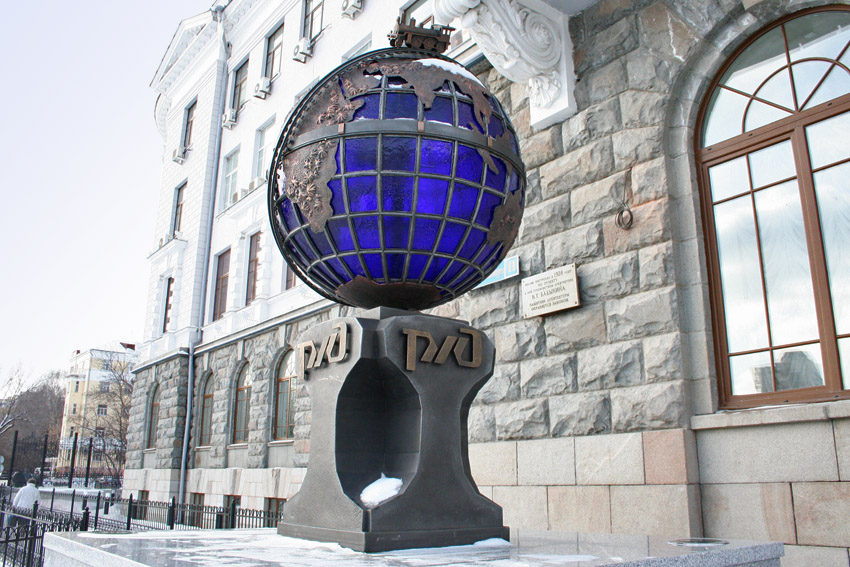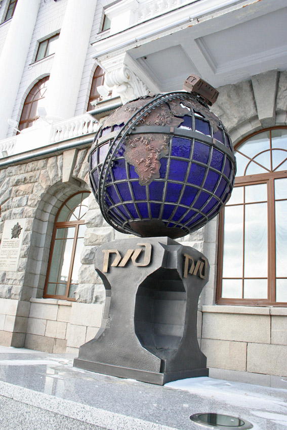 У главного входа в Управление ЖД появились малые скульптурные формы - глобусы. На основании в виде рельс расположился новый бренд РЖД, колесо с крыльями кануло в лету.