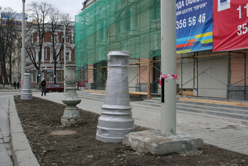 Появились базы на новых фонарях. Старые фонари срезают. Жалко старые базы, имеющие более художественную ценность. ![]() Малые фонари кроме сквера, устанавливают и вдоль тротуара. ![]() ![]() |