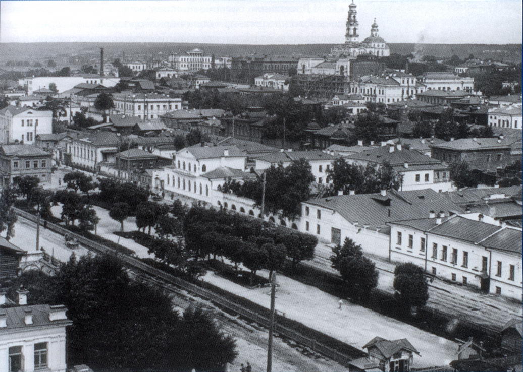 (без подписи) ![]() Ещё одно известное фото. Панорама с колокольни Екатерининской церкви на северо-восток. На переднем плане - Нуровский сквер, сразу за которым Пушкинская улица (ныне ул. Пушкина). |