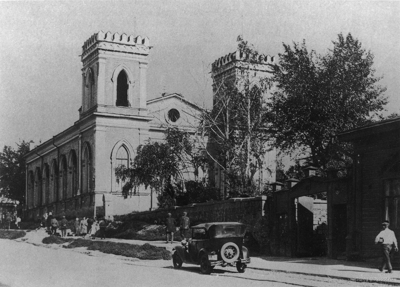 Кирха на Главном проспекте. Вторая половина XIX века. Фото 1930-х годов The Lutheran church on Glavny Avenue.The 2nd half of the 19th century. 1930s Кирха, удачно вписанная в рельеф местности, господствовала в застройке квартала. Главным западным фасадом с мощными башнями-звонницами она была обращена к Церковной стороне и стала еще одной эстетически важной вертикалью в ее панораме. Кирха обозначала и границу юго-восточной части города по Солдатской улице, на которую она выходила алтарной частью. В 1950-е годы на этом месте был построен многоэтажный жилой дом с магазинами, так называемый Дом артистов. ![]() Фотокоррекция: ArtOleg -------------------- |