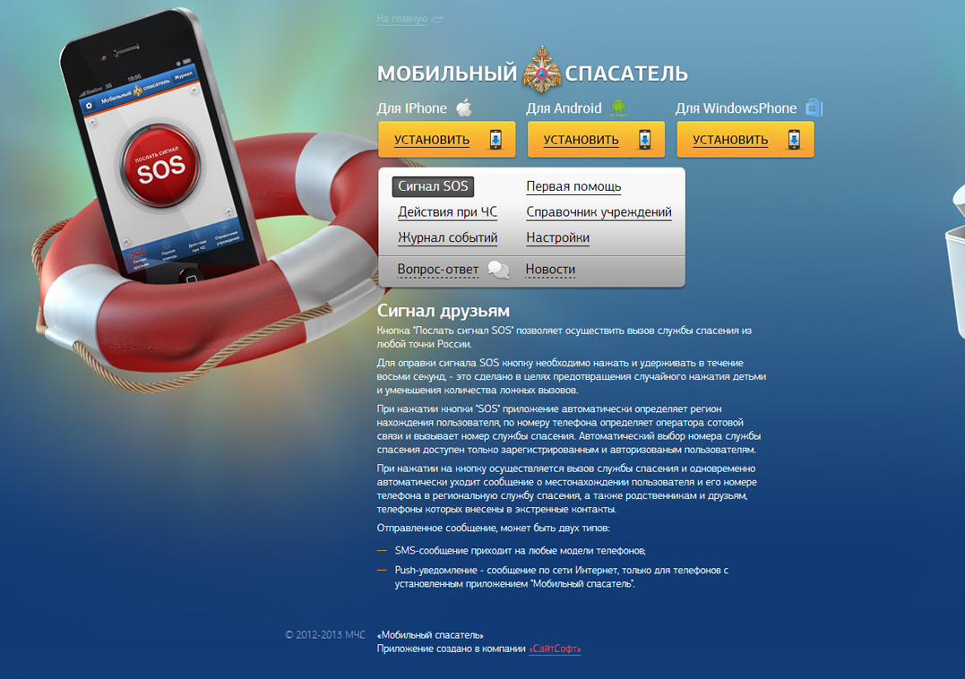 Приложение «Мобильный спасатель» разработано для помощи гражданам, попавшим в чрезвычайную ситуацию или ставшим свидетелями ЧС. Приложение создано в компании «СайтСофт» ![]() ![]() ![]() spasatel.mchs.ru -------------------- |