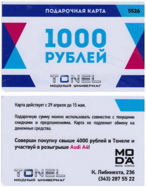 "Подарочная карта 1000 рублей. Универмаг TONEL"