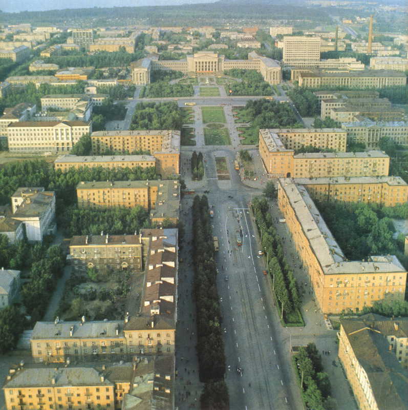 1979 год. Проспект Ленина с птичьего полета на участке жилого района Втузгородок. Площадь Кирова. Главный корпус Уральского политехнического института. Далее — Шарташский лесопарк.