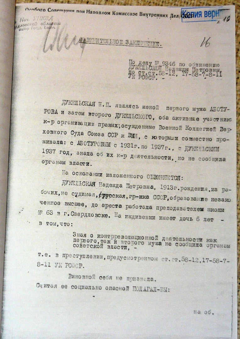 Постановление: 5 лет ИТЛ. И отметка о первом лагере - Акмолинск, АЛЖИР, лагерь жён изменников родины ![]() Обвинительное заключение. 2-я страница. "Виновной себя не признала ... Вещественных доказательств по делу нет" ![]() Обвинительное заключение. 1-я страница. "Виновной себя не признала ... Вещественных доказательств по делу нет" ![]() Уголовное дело моей бабушки как ЧСИР - члена семьи изменника родины. Копия из Архива Административных органов Свердловской области (ГААОСО) ![]() -------------------- |