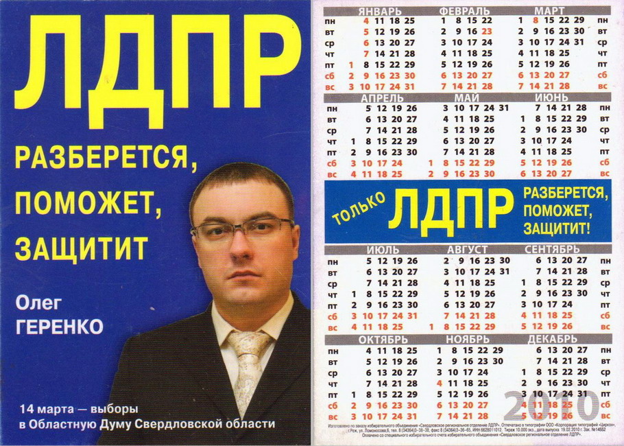 Карманный календарик "г.Екатеринбург.Выборы в областную думу. Олег Геренко. 2010 год."