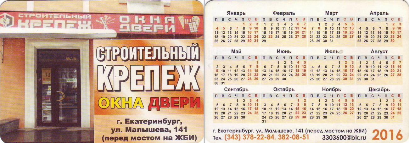 Карманный календарик "г.Екатеринбург. Магазин «Строительный крепёж. Окна. Двери». 2016 г."