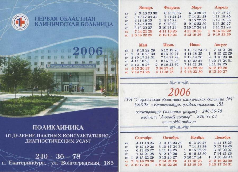 Карманный календарик "Первая областная клиническая больница. 2006 г."