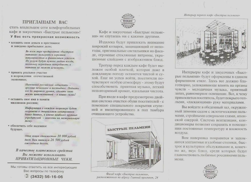 ![]() ![]() В 1993-94 годах многие НОРМАЛЬНЫЕ жители Свердловской области, и прежде всего Екатеринбурга, меняли свои государственные ценные бумаги (ваучеры) на акции АООТ "Технезис-Быстрые пельмени". Проект поддерживался руководством области. Вот один абзац из аналитического материала по Свердловской области: - «Другой интересный проект начала осуществлять одна из крупнейших финансовых и инвестиционных корпораций России «Технезис», являющаяся также представителем на российском рынке группы заводов «Рено». Этот проект называется «Быстрые пельмени», на реализацию его уже затрачено 35 млрд. руб. Руководитель проекта — В. Косков. Планируется в течение года открыть сеть пельменных по типу «Макдоналдс» по всему Уралу, с перспективой выйти на общероссийский рынок. Характерно, что в наблюдательный совет АО «Технезис - быстрые пельмени» вошли директор Верх-Исетского металлургического завода, тренер волейбольной команды «Уралочка», секретарь Епархиального управления, председатель комиссии по защите прав потребителя горсовета. 1 января 1994 г. планируется провести презентацию «Быстрых пельменей»». До сих пор непонятно, это была компания по отъёму ваучеров, или действительно социально значимый, но неудавшийся, проект в сфере общественного питания. Сертификат акций серии А-1 с купонами. ![]() |