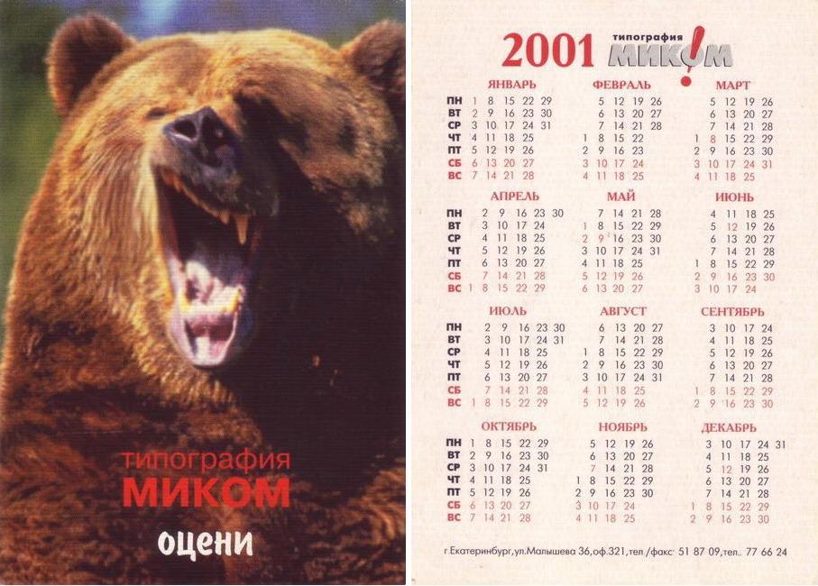 Карманный календарик "г.Екатеринбург. Типография «МИКОМ». 2001 г."