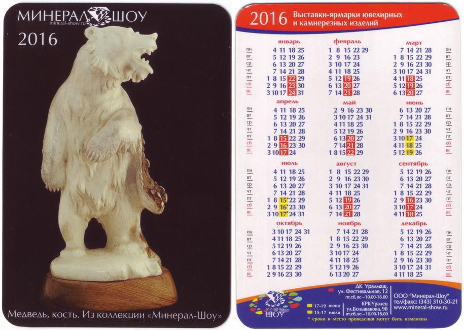 Карманный календарик "г.Екатеринбург. Выставка-ярмарка «Минерал-Шоу». Медведь. 2016 г."