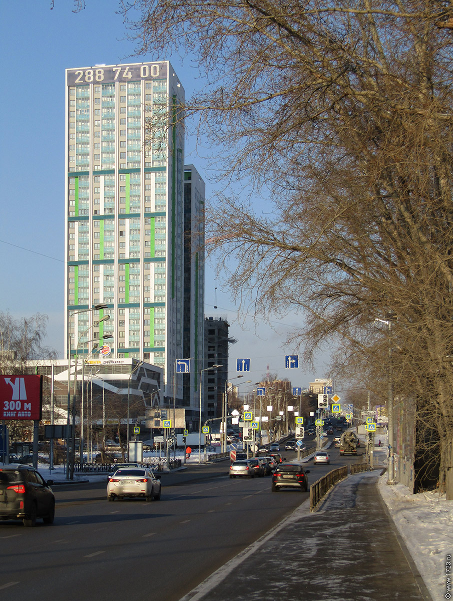 Верх-Исетский, Ленинский и Чкаловский административный район. Жилой район «Центральный», "Визовский", "Юго-Западный", "Южный", «Вторчермет». В старом Екатеринбурге это была крайняя, западная улица города. На пересечении с Главным проспектом стояла Московская застава в виде двух обелисков. От заставы начинался Московский тракт. Название тракта перешло на название улицы. Улица Московская сохранила своё историческое название. Улица Московская расположена между Хомякова (от ул.Челюскинцев) и пер.Рижский (до ул.Патриса Лумумбы). Улица прямая, направление север - юг. Общая длина улицы 6 550 метров. К Верх-Исетскому району относятся: Чётная сторона улицы длиной 2900 от Хомякова до Большакова. Нечётная сторона улицы длиной 620 метров от Хомякова до Ленина. К Ленинскому району относятся: Чётная сторона улицы длиной 3650 метров от ул.Большакова до пер.Рижский. Нечётная сторона улицы длиной 4200 от Ленина до Николая Островского. К Чкаловскому району относится нечётная сторона улицы длиной 1730 метров от Николая Островского до пер.Рижский. Нумерация домов идёт от Хомякова. Дома по чётной стороне с №2 по №232. Дома по нечётной стороне с №1 по №285. Улица Московская является важной магистралью города и является частью малого городского кольца. В 2011 году была полностью открыта развязка улиц Московская-Большакова-Ясная-Фурманова с самой длинной эстакадой в городе. В 2014г. была открыта развязка Московская-Объездная, по типу «полный клеверный лист». В данный момент идут работы по реконструкции нескольких перекрёстков в южной части улицы. От дореволюционного Екатеринбурга на Московской сохранилось только три здания: - Московская, 19. (перестроено-надстроено). - бывшая школа (Московская, 26). - бывшая школа (Радищева, 51). В начале улицы есть интересные здания и комплексы советского периода. Вдоль улицы расположены крупные современные жилые комплексы: ЖК "Москва", ЖК "Арбатский", ЖК"Московский", "Гулливер", ЖК "Московский квартал". В южной части улицы есть большой район частного сектора. По чётной стороне от ул.Хасановская до Расковой. По нечётной стороне от Щорса до Авиационной. Большая часть которого будет расселена и застроена. В конце улицы есть коллективный сад "Лесной-2". Перед Объездной улица идёт вдоль лесопарка "Юго-Западный" и ботанического сада УрО РАН. ![]() |