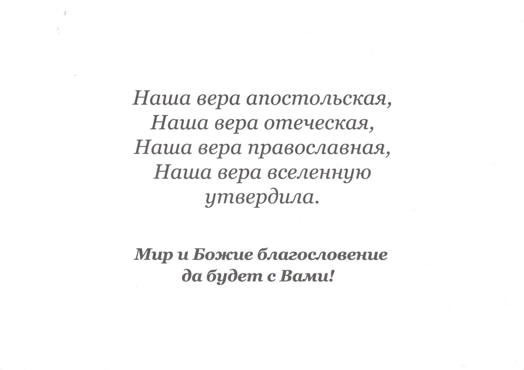 ![]() Открытка с собором Святой Екатерины. Раздавали на молебне в праздник Торжества Православия 17.03.2019, на месте предполагаемого строительства. Размер 210 мм х 148 мм Материал: картон. На обороте слова: Наша вера апостольская, Наша вера отеческая, Наша вера православная, Наша вера вселенную утвердила. Мир и Божие благословение да будет с Вами! Dim96: обратная сторона ![]() |