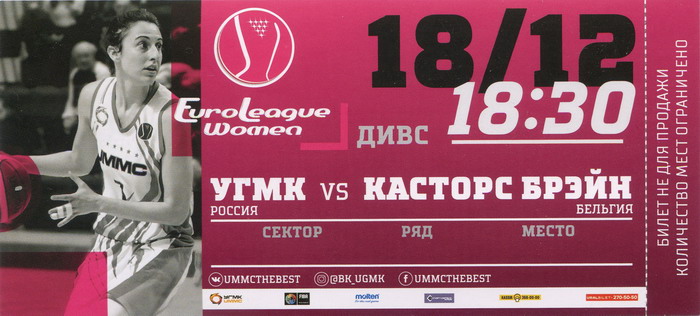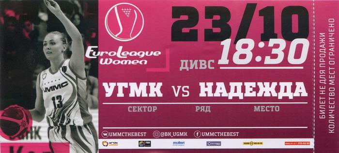 Билет "г.Екатеринбург. ДИВС. Чемпионат женской баскетбольной Евролиги. УГМК - Надежда. 23 октября 2019 г."