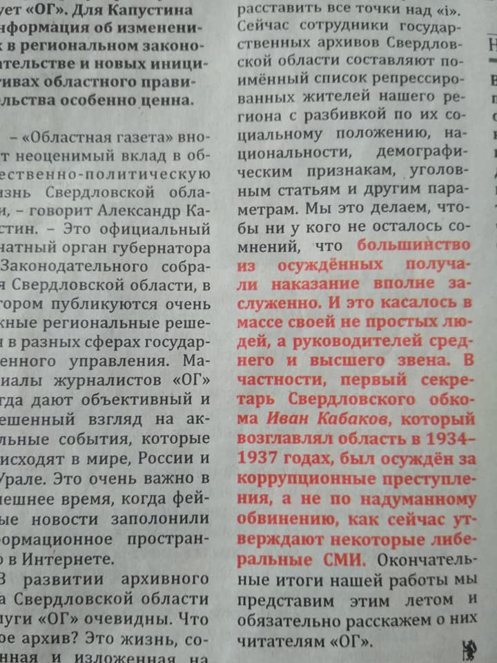 Вчера, 6 марта, в "Областной газете" опубликовано интервью с начальником управления архивами Свердловской области А. А. Капустиным "Источник информации для будущих поколений". Вот фрагмент из этого интервью, ради которого оно и было опубликовано: " Сейчас сотрудники государственных архивов Свердловской области составляют поимённый список репрессированных жителей нашего региона с разбивкой по их социальному положению, национальности, демографическим признакам, уголовным статьям и другим параметрам. Мы это делаем, чтобы ни у кого не осталось сомнений, что большинство из осуждённых получали наказание вполне заслуженно. И это касалось в массе своей не простых людей, а руководителей среднего и высшего звена. В частности, первый секретарь Свердловского обкома Иван Кабаков, который возглавлял область в 1934-1937 годах, был осуждён за коррупционные преступления, а не по надуманному обвинению, как сейчас утверждают некоторые либеральные СМИ". В связи с этой публикацией считаю своим долгом заявить: 1) Александр Александрович Капустин, без малого тридцать лет возглавляющий областную архивную службу, и прежде позволял себе недопустимые как с исторической, так и с морально-нравственной точки зрения высказывания, оскорбляющие память жертв государственного террора в нашей стране. Утверждение А. А. Капустина в интервью 6 марта делает его в моих глазах человеком нерукопожатным. 2) На ближайшем заседании бюро Межрегионального общественного совета по развитию Музейно-мемориального комплекса памяти жертв политических репрессий в Екатеринбурге я предложу коллегам опубликовать в "Областной газете" опровержение чудовищного по своей сути заявления А. А. Капустина. 3) На мартовском заседании комиссии Свердловской области по восстановлению прав реабилитированных жертв политических репрессий я поставлю вопрос о выводе А. А. Капустина из состава комиссии, а также буду ходатайствовать перед главой комиссии, вице-губернатором Свердловской области С. Ю. Бидонько поставить перед губернатором Е. В. Куйвашевым вопрос о необходимости уволить А. А. Капустина, либо не имеющего никакого представления о делах по политических репрессиям, либо сознательно оболгавшего большинство жертв репрессий, с должности начальника управления архивами Свердловской области. А всем гражданам, кто чувствуют себя оскорблёнными заявлением г-на Капустина, предлагаю высказывать своё отношение к этому заявлению как лично А. А. Капустину, так и его начальству. ![]() *соцсеть принадлежит компании Meta, признанной экстремистской организацией и запрещенной в РФ. -------------------- |