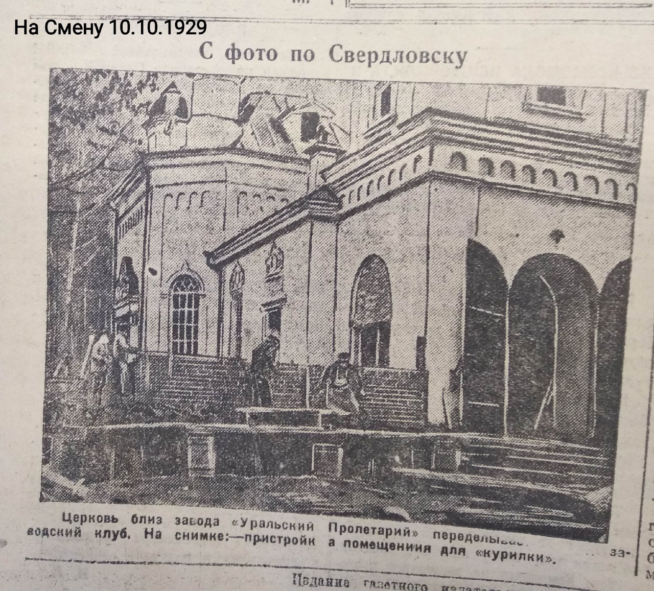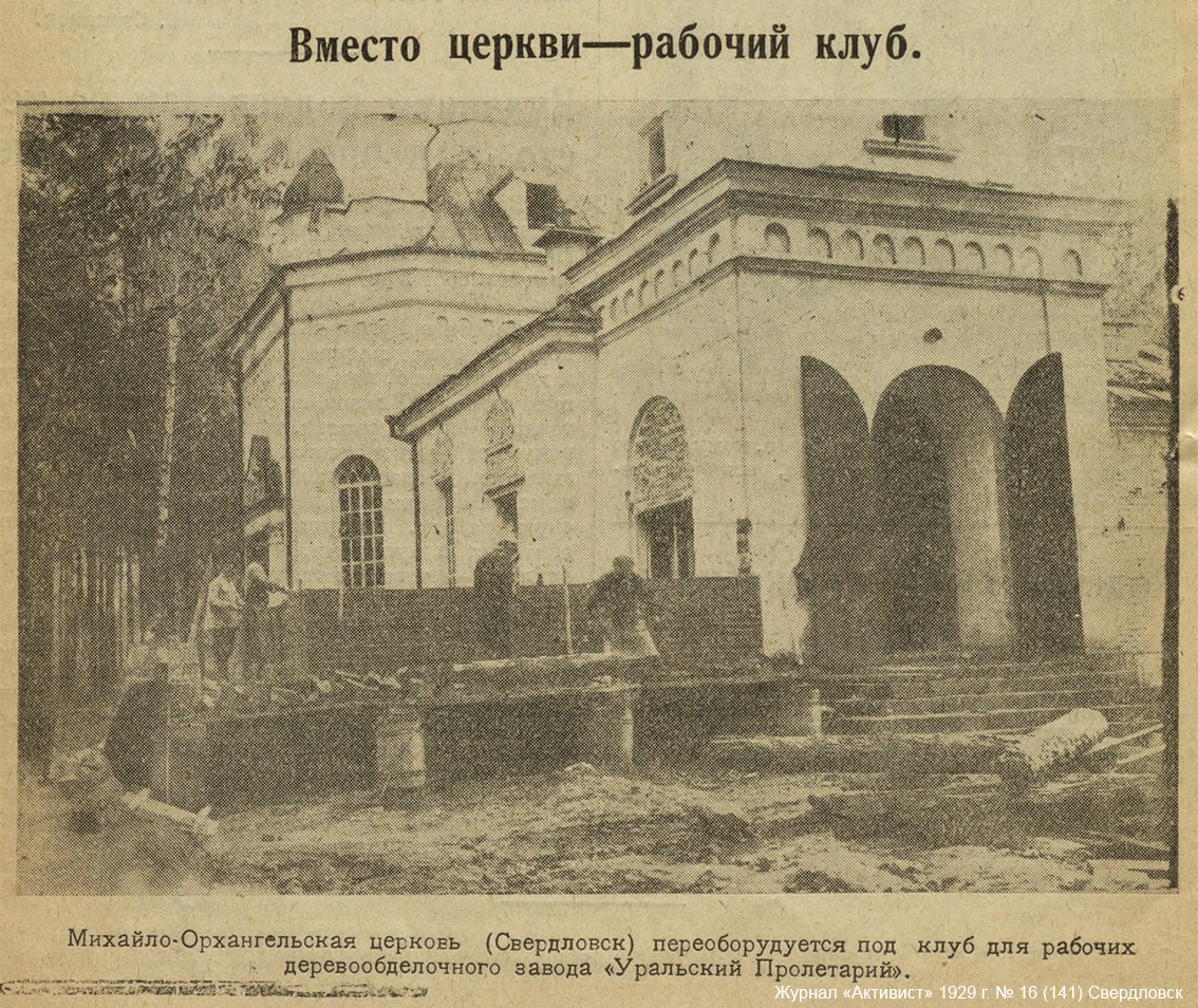 Вместо церкви — рабочий клуб. Михайло-Орхангельская церковь(Свердловск) переоборудуется под клуб для рабочих деревообделочного завода «Уральский Пролетарий». ![]() Источник -------------------- |