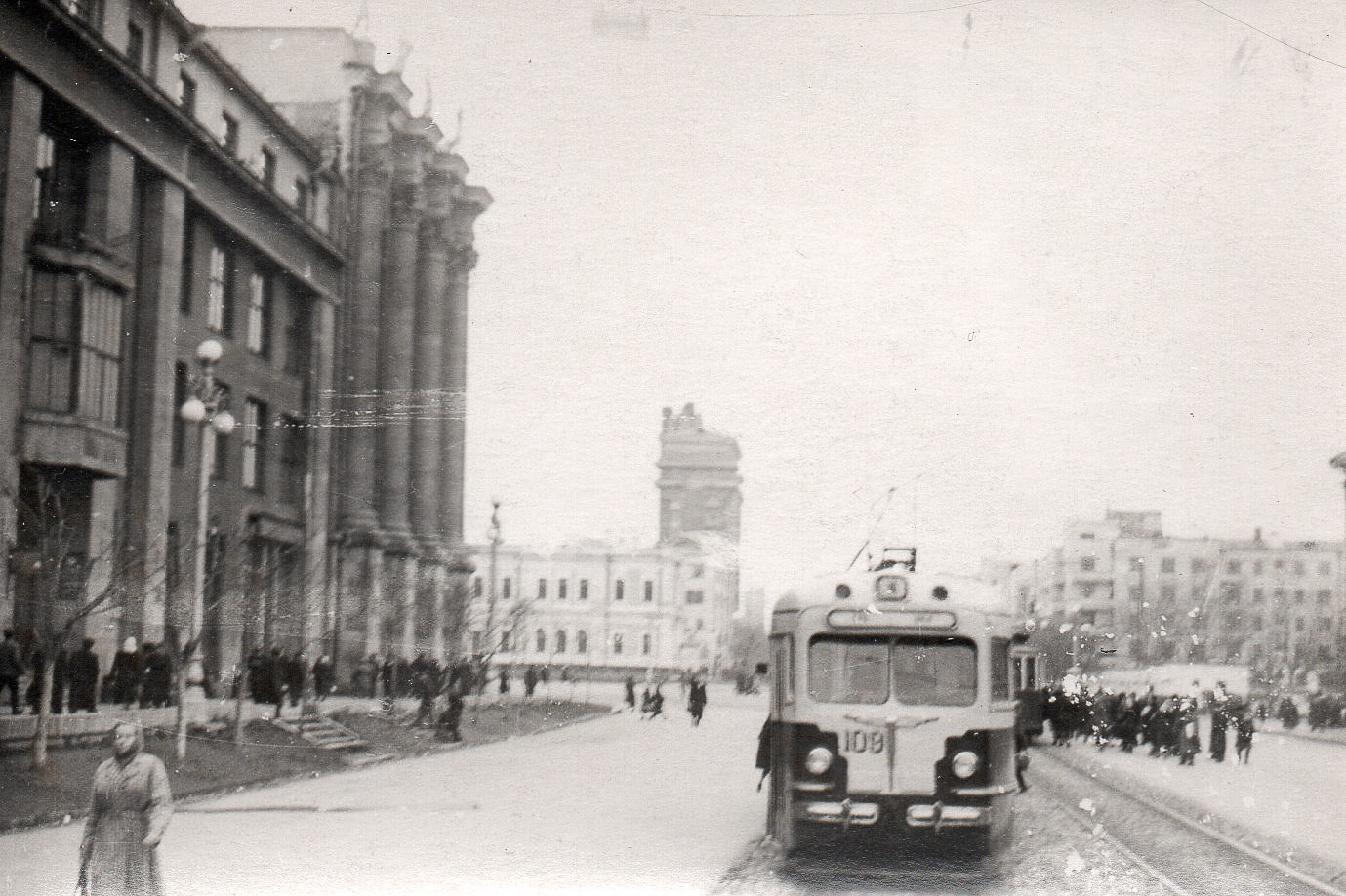 1956-1966 гг. Репина-Малышева. Троллейбусы МТБ-82 на фоне дома по адресу ул. Малышева, 1. Фото - Павел Гас.