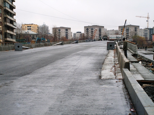 Сегодня днем был на мосту. Уже полностю готово асфальтовое покрытие на нем. Ставят ограждения и подготавливают места для установки опор контактной сети. Вроде немного уже осталось ... В минувшие выходные в Екатеринбурге специалисты треста «Уралтрансспецстрой» и Строительного Управления №21 выполнили укладку асфальта на автомобильном путепроводе, сооружаемом над железнодорожными путями Транссибирской магистрали в районе пересечения улиц Восточная-Шевченко-Советская. Общая площадь асфальтирования рабочей поверхности моста и примыкающих к нему подъездных путей составила 7.5 тысяч кв. метров. Все работы были выполнены в соответствии с утвержденной проектной документацией. Перед асфальтированием на объекте специальная рабочая комиссия произвела приемку так называемых скрытых работ, выполненных специалистами Мостоотряда-72. Проверялась надежность и качество омоноличенных швов и стяжек между основными железобетонными конструкциями автоэстакады. В настоящее время на мосту заканчиваются работы по монтажу тротуаров и установке перильного ограждения. Параллельно ведется отсыпка обочин проезжей части на подъезде к путепроводу со стороны улицы Советской. Устанавливаются ограждающие дорожные поребрики. До конца текущей недели все эти работы должны быть закончены и потенциально мост будет готов к пропуску автомобильного движения на участке от улицы Уральской до улицы Луначарского. Что касается дальнейших работ, то в ближайшие две недели дорожные строители намерены продвигаться по оси будущей троллейбусной трассы вглубь Пионерского поселка. Согласно задачам, поставленным Главой Екатеринбурга Аркадием Чернецким, до конца октября им необходимо закончить реконструкцию и закатать асфальтом отрезок улицы Советской от Уральской до улицы Июльской. В начале ноября на всем протяжении нового троллейбусного маршрута планируется установить опоры контактной сети и приступить к ее монтажу. А к концу месяца, после завершения работ на всех участках нового транспортного коридора, образуемого новым путепроводом, а также улицами Советской, Шевченко и переулком Красным, откроется сквозное движение для всех видов автомобильного транспорта, включая троллейбусное сообщение. Напомним, что по задумке городских властей новая троллейбусная линия свяжет центральную часть города и жилые массивы Пионерского поселка. Курсировать «усатые» машины будут от станции метро «Динамо» до улицы Сулимова, где на пересечении с улицей Советской для них будет обустроено разворотное кольцо. В перспективе движение троллейбусов планируется продлить вглубь Пионерского поселка, в направлении улиц Вилонова-Учителей, сообщает пресс-служба Администрации Екатеринбурга. JustMedia |