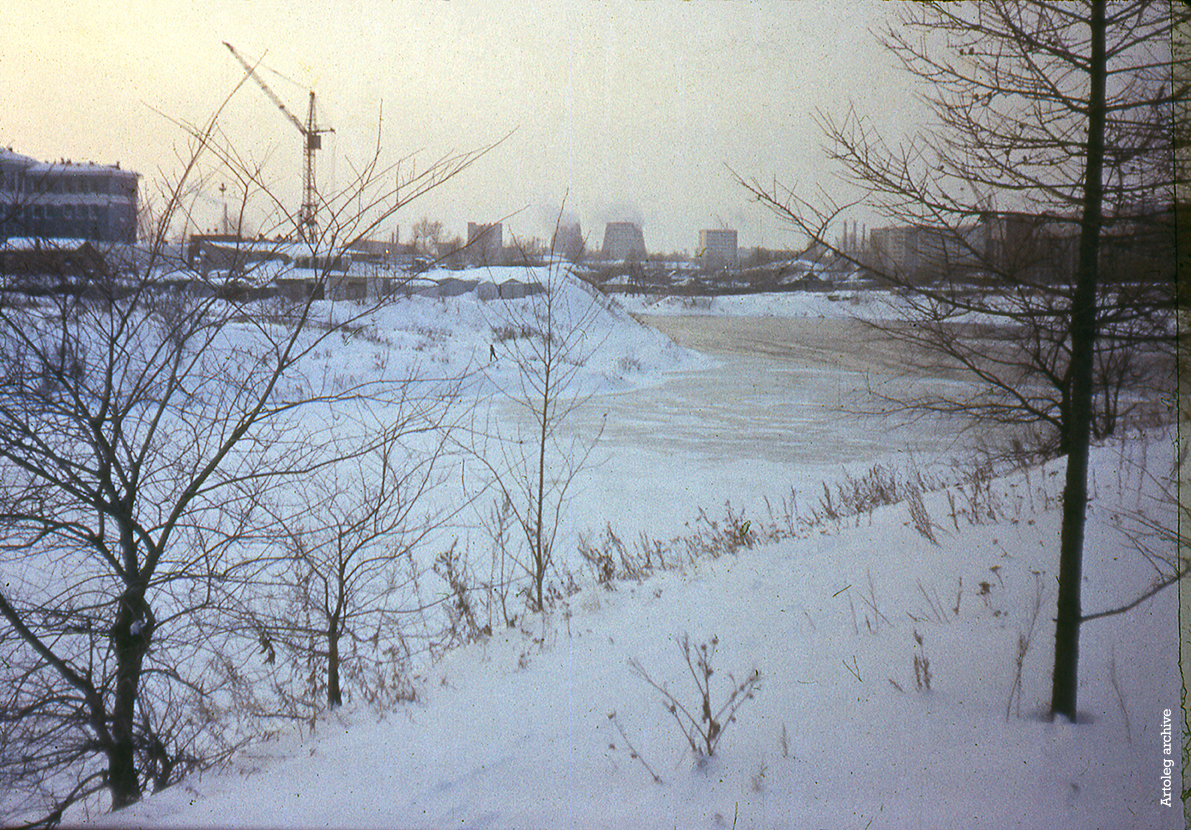 Вид на реку Исеть от института железнодорожного транспорта (УЭМИИТ, теперь УрГУПС). На противоположном берегу идет строительство учебно-спортивного комплекса у педучилища, ул. Юмашева 20. Декабрь 1985 г.