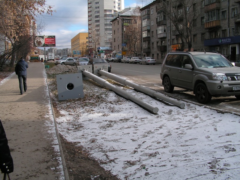 Вот фотки. Сегодня. Утро. Навесили траверсы для контактной сети трола (по пути следования тролла ещё многих опор нет). Слева ограждающие заборчики над ЖД путями ![]() |