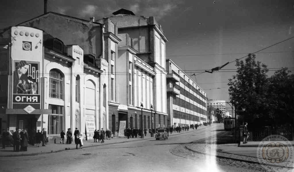 Город Свердловск. Угол улиц Ленина и Карла Либкнехта. Афиша кинофильма «Два бойца». 1948 г. ГАСО. Ф. Ф-1. Оп. 32-а. Д. 1902.