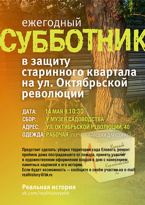 14 мая 2016 г. приглашаем на ежегодный субботник в защиту старинного квартала на улице Октябрьской революции.