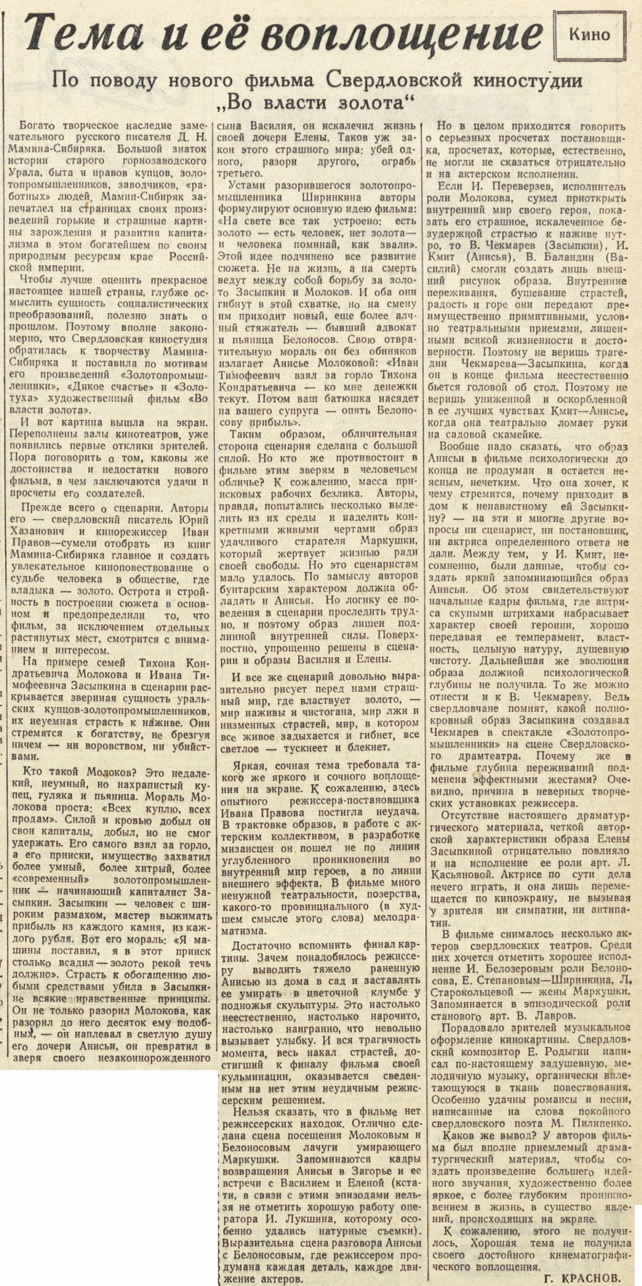 По поводу нового фильма Свердловской киностудии "Во власти золота". "Вечерний Свердловск", 3 февраля 1958г. ![]() |