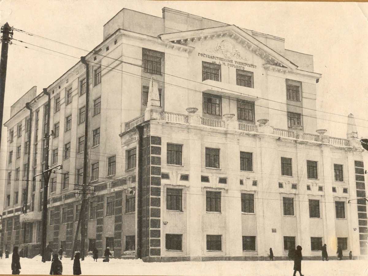 На фронтоне надпись: Государственный университет им. А. М. Горького. Фото архив УрФУ. ![]() |