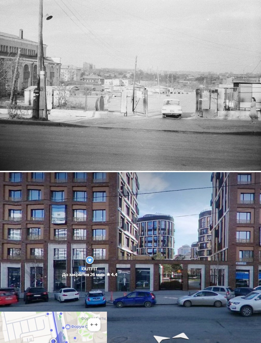 ![]() Точка съёмки старого и современного фото не совпадает. Ворота рынка были на 10-15 метров ближе к ул. Радищева, чем ворота ЖК. Но совпадающих точек съёмки с тротуара на панорамах Яндекса, к сожалению, нет. Метки: Центральный рынок. Автор первого фото не установлен. Возможно, это снимок Геннадия Петровича Павлова. |