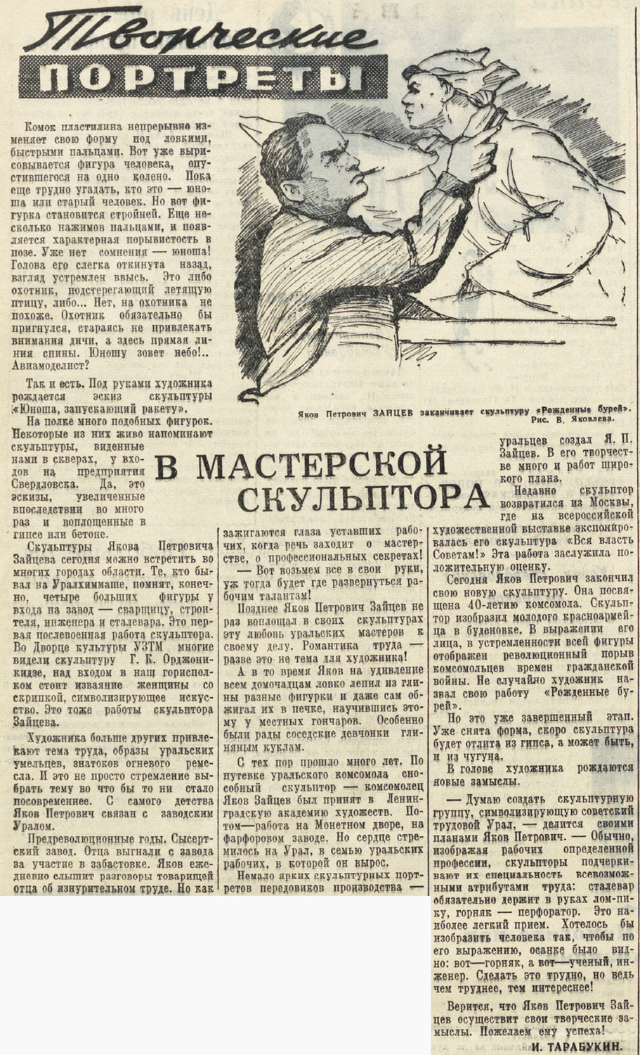 Скульптор Яков Петрович Зайцев. И.Тарабукин. "Вечерний Свердловск", 7 февраля 1958г. ![]() |