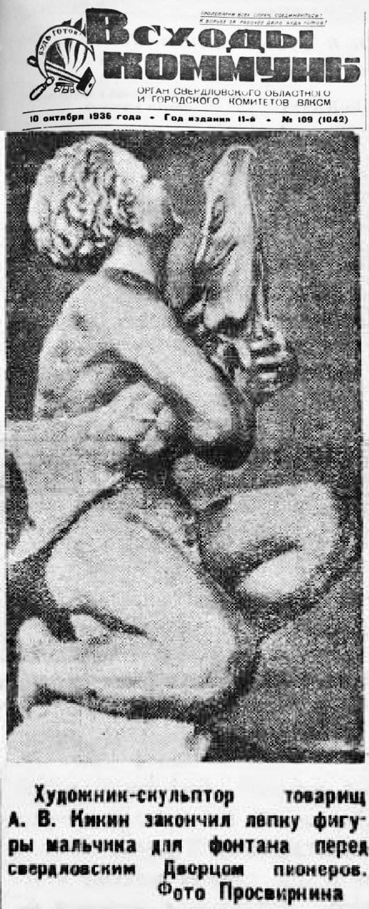Художник-скульптор товарищ А.В. Кикин закончил лепку фигуры мальчика для фонтана перед свердловским Дворцом пионеров.