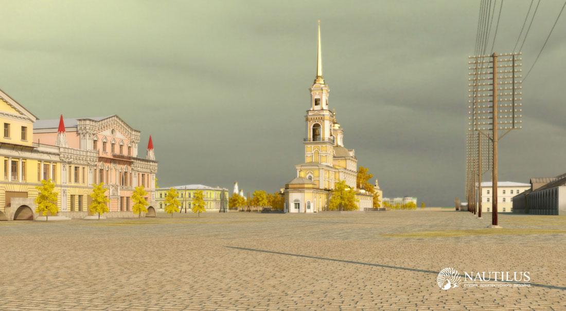 Реконструкция Площади 1905 года с "восстановленным" средствами компьютерной графики Кафедральным собором. Рендеры студии архитектурного дизайна «Наутилус».
