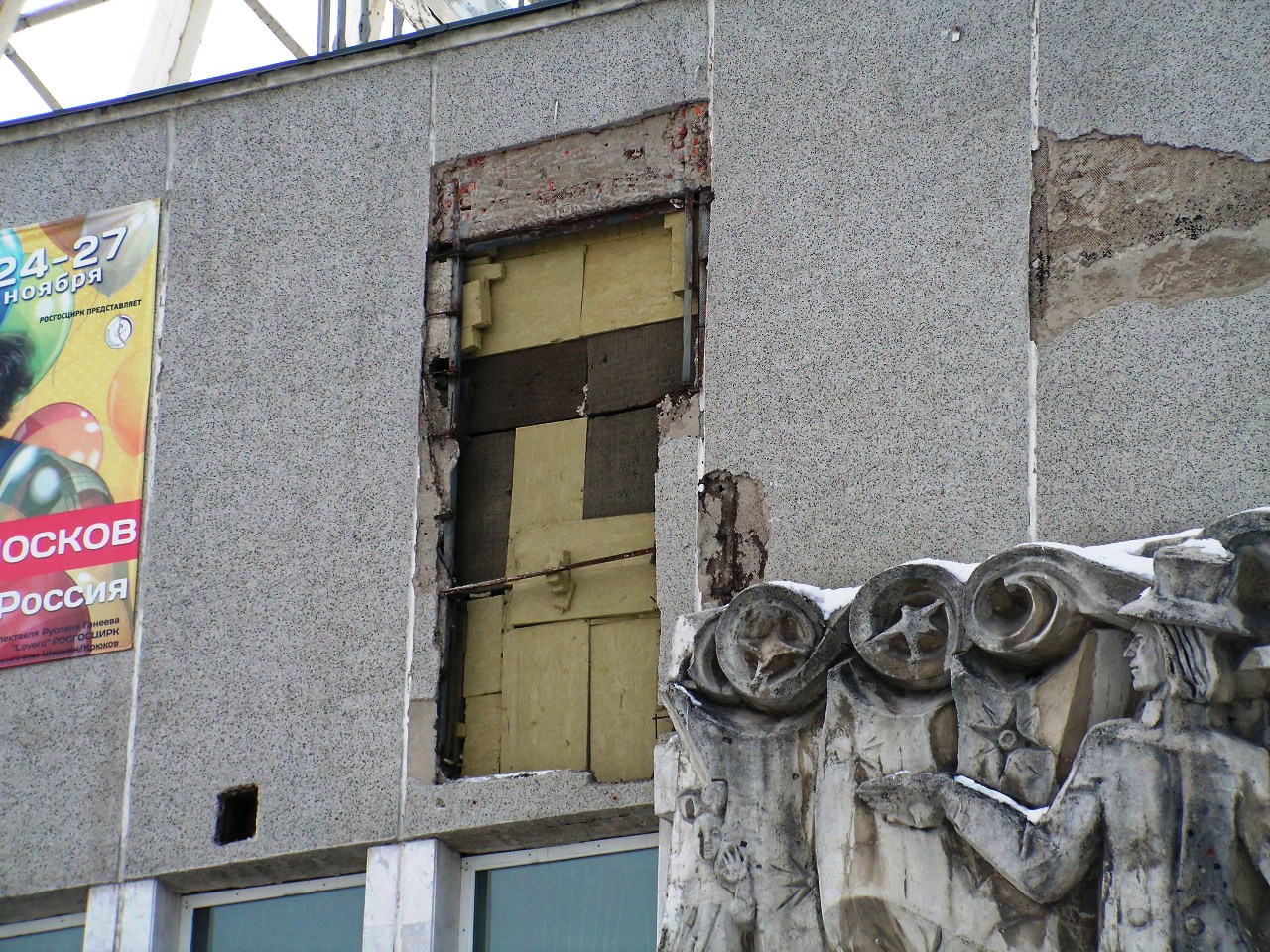 Дырки на восточном фасаде (со стороны музея) закрыли афишами.