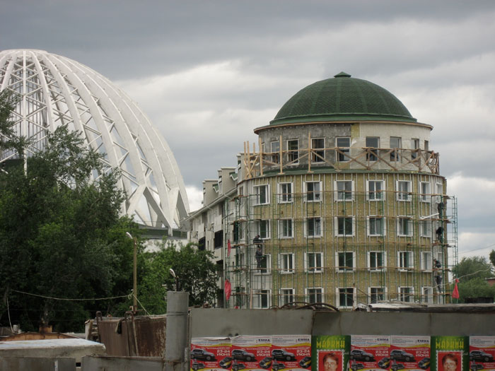 С юга от цирка полным ходом идёт реконструкция цирковой гостиницы. Сначала был надстроен этаж, а сейчас с южной стороны пристрой с куполом.