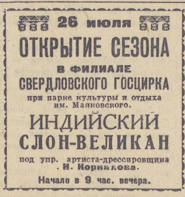 Индийский слон-великан. Дрессировщик Н.Корнилов. «Уральский Рабочий». 25 июля 1941г. ![]() |