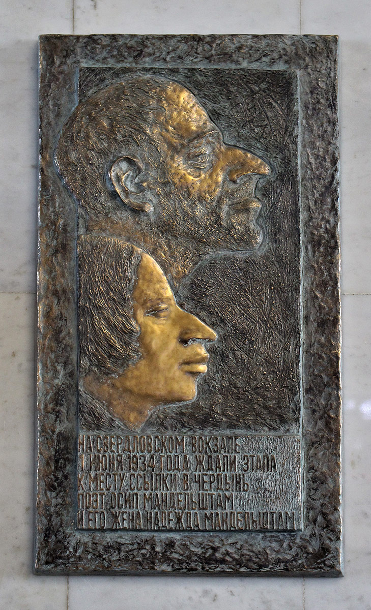 В здании вокзала. Главный вход. Второй этаж. На доске текст: "На Свердловском вокзале 1 июня 1934 года ждали этапа к месту ссылки в Чердынь поэт Осип Мандельштам и его жена Надежда Мандельштам". Фото Кузнецов Леонид. ![]() |
