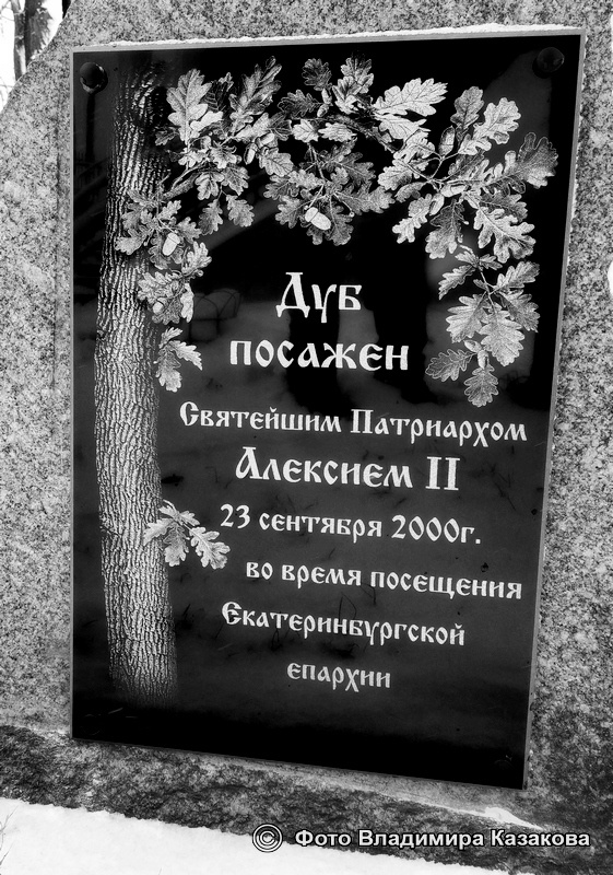 "Дуб посажен Святейшим Патриархом Алексием II 23 сентября 2000 г. во время посещения Екатеринбургской епархии". ![]() Фото Владимира Казакова. Взято в группе "Екатеринбург XXI" ВКонтакте. |