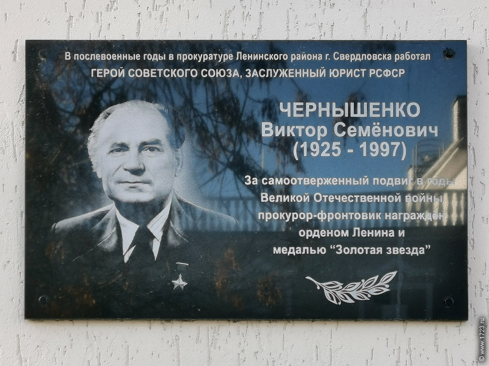 На доске текст: "В послевоенные годы в прокуратуре Ленинского района г.Свердловска работал Герой Советского Союза, заслуженный юрист РСФСР Чернышенко Виктор Семёнович (1925-1997) За самоотверженный подвиг в годы Великой Отечественной войны прокурор-фронтовик награждён орденом Ленина и медалью "Золотая звезда". ![]() |